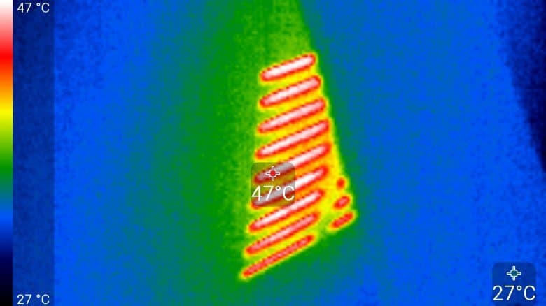 Видно, что нагрев локализован в центральной части. Теплоснимок вентиляционной решетки на задней панели показывает область с максимальным нагревом: