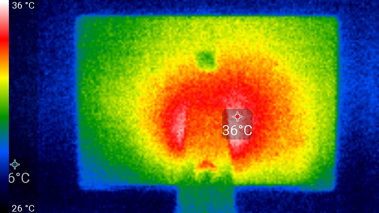 Пиковое потребление системы составило 320 Вт. Нагрев задней панели можно оценить по снимку, полученному с помощью теплокамеры: