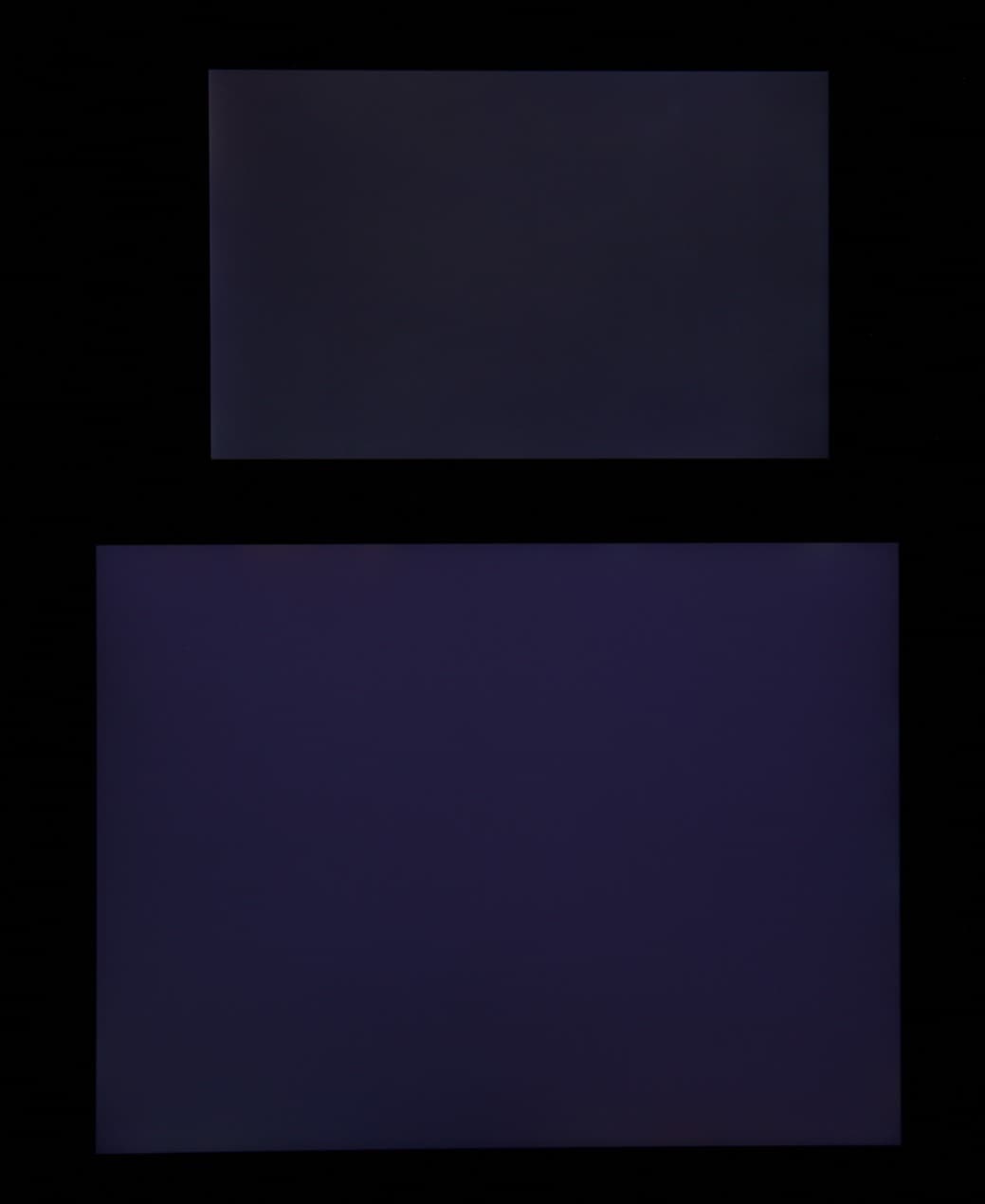 Яркость под углом у экранов уменьшилась (как минимум в 4 раза, исходя из разницы в выдержке), но в случае Apple iPad (A1954) падение яркости меньше. Черное поле при отклонении по диагонали высветляется слабо и приобретает фиолетовый или красно-фиолетовый оттенок. Фотографии ниже это демонстрируют (яркость белых участков в перпендикулярном плоскости экранов направлении примерно одинаковая!):