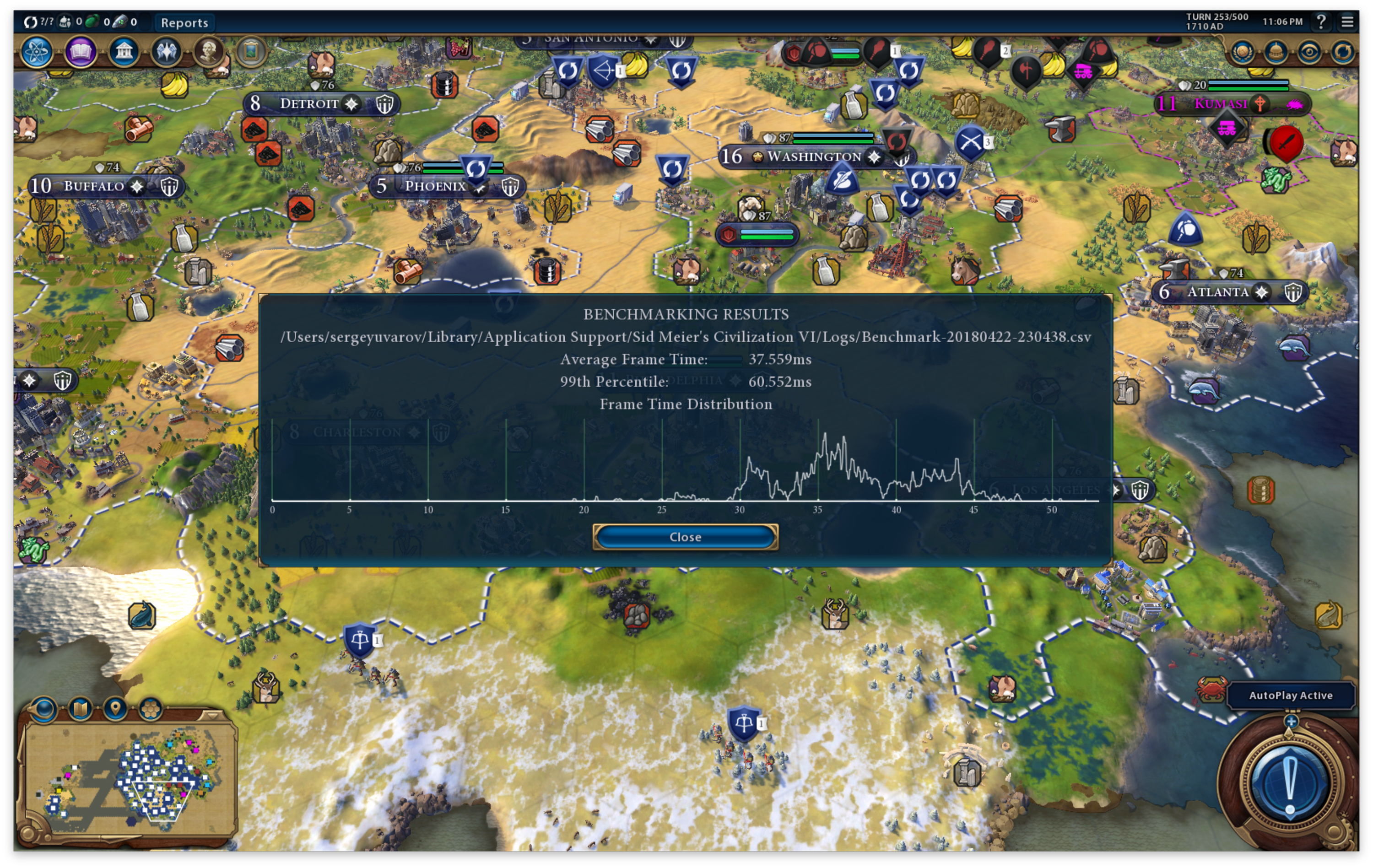 Для тестирования производительности в играх мы в новой версии методики используем встроенный бенчмарк Civilization VI. Он выводит два показателя: Average Frame Time и 99th Percentile.