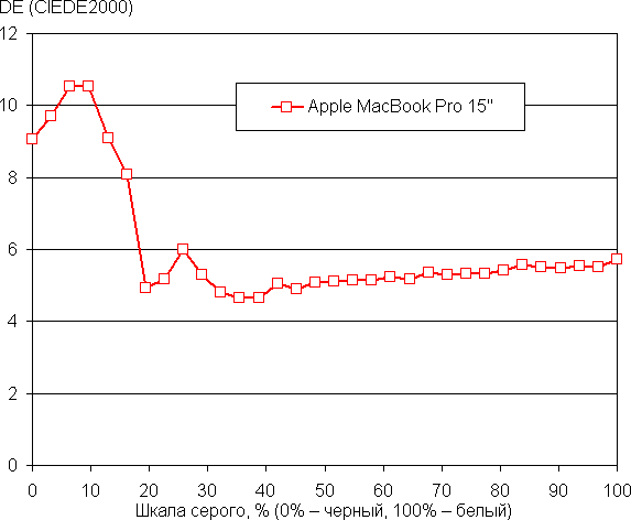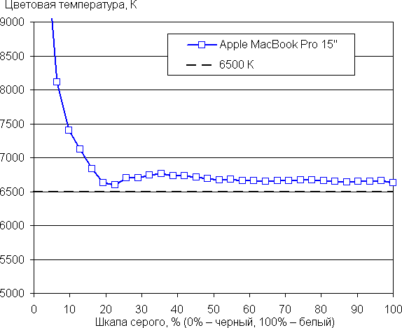 Также впервые в MacBook Pro присутствует функция True Tone, которая подстраивает цветовой баланс под условия окружающей среды. К примеру, мы ее активировали и поместили ноутбук под светодиодные светильники с холодным белым светом, получили в итоге значения 6,0 для ΔE и 6700 К для цветовой температуры. Под галогеновой лампой накаливания (теплый свет) — 2,6 и 5350 К, то есть цветовая температура стала ниже. Функция работает так, как и ожидалось. В полной темноте — 10 и 5800 К. Отметим, что сейчас сложившимся стандартом является калибровка устройств отображения к точке белого в 6500 К, но в принципе, коррекция под цветовую температуру внешнего света может принести пользу, если хочется добиться лучшего соответствия изображения на экране с тем, что видно на бумаге (или на любом носителе, на котором цвета формируются за счет отражения падающего света) в текущих условиях.