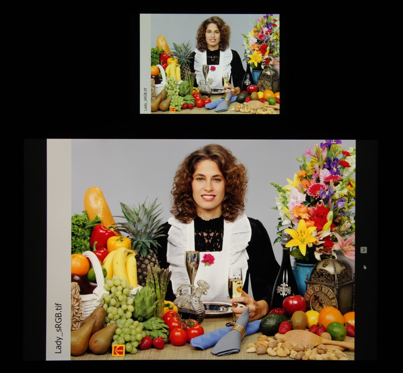 Заметим, что такие спектры встречаются в мобильных и не очень мобильных устройствах Apple и других производителей. По всей видимости, в подобных экранах используются светодиоды с синим излучателем и зеленым и красным люминофором (обычно — синий излучатель и желтый люминофор), что в сочетании со специальными светофильтрами матрицы и позволяет получить широкий цветовой охват. Да, и в красном люминофоре, видимо, используются так называемые квантовые точки. Для потребительского устройства, не поддерживающего управление цветом, широкий цветовой охват является ни как не достоинством, а существенным недостатком, так как в итоге цвета изображений — рисунков, фотографий и фильмов, — ориентированных на пространство sRGB (а таких подавляющее большинство), имеют неестественную насыщенность. Особенно это заметно на узнаваемых оттенках, например на оттенках кожи. В данном случае управление цветом присутствует, поэтому вывод изображений, в которых прописан профиль sRGB или не прописано вообще никакого профиля, выполняется с коррекцией охвата до sRGB. В итоге визуально цвета имеют естественную насыщенность.
