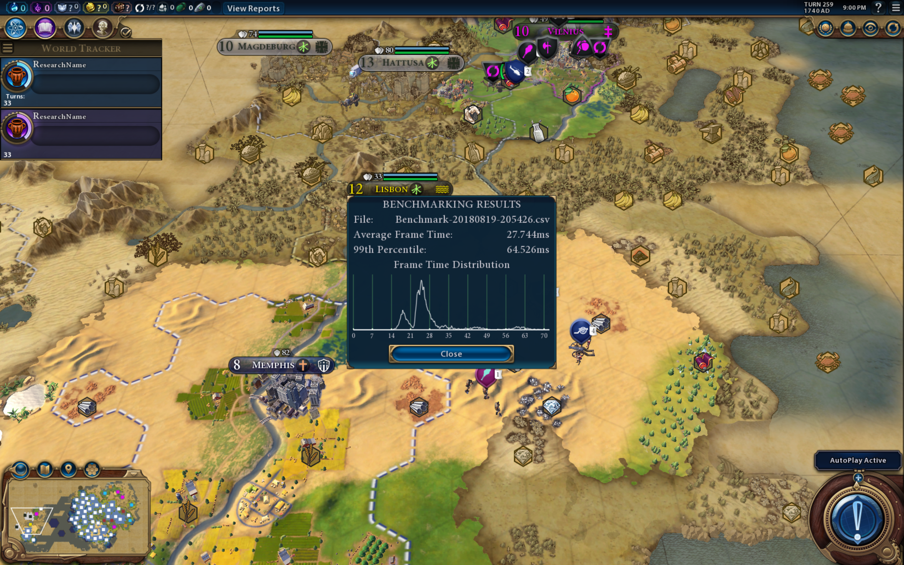 Для тестирования производительности в играх мы в новой версии методики используем встроенный бенчмарк Civilization VI. Он выводит два показателя: Average Frame Time и 99th Percentile.