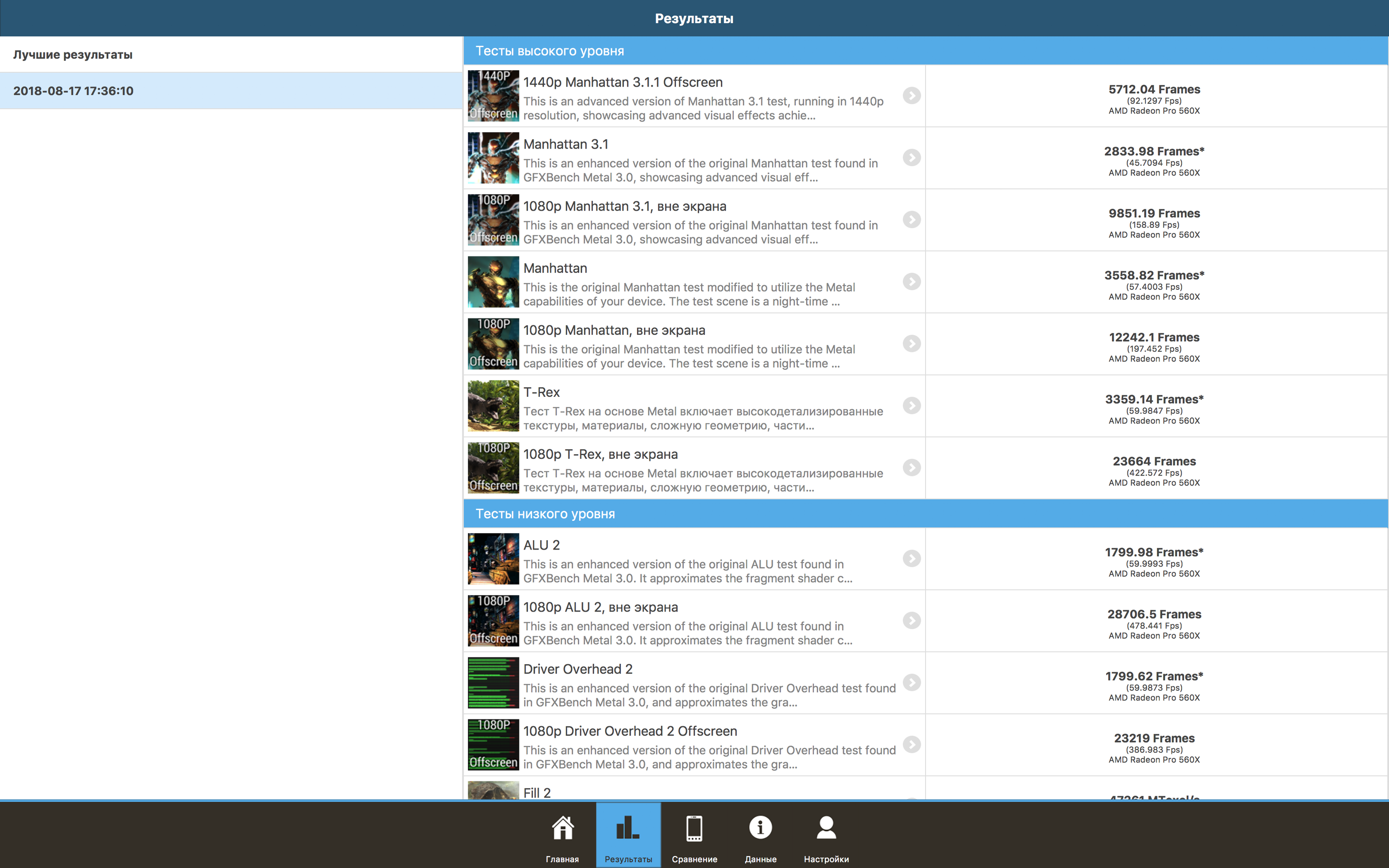 Далее у нас тестирование 3D-графики, и первым идет бенчмарк GFX Benchmark Metal.