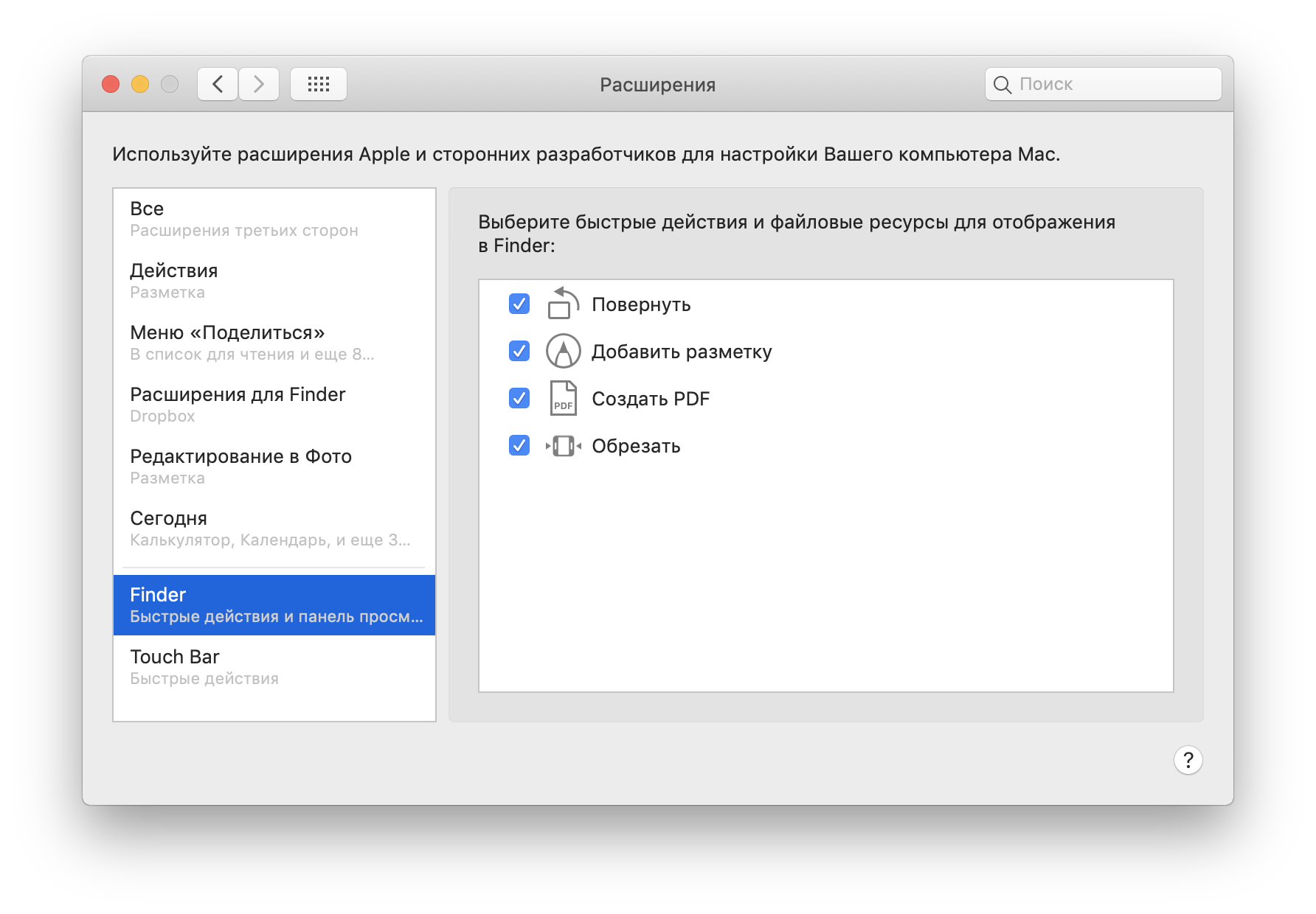 В Системных настройках можно указать, какие опции редактирования будут доступны в Finder.