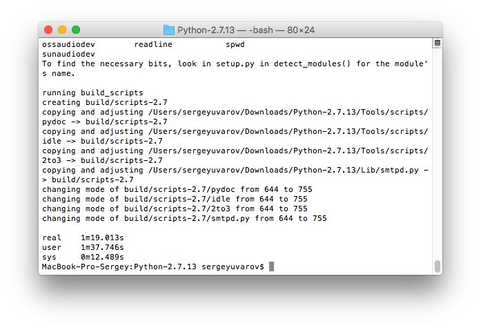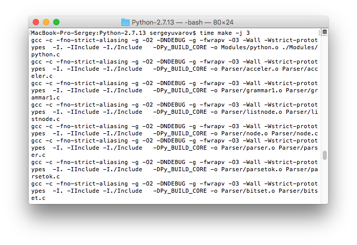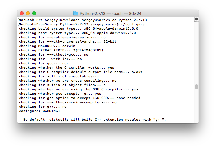 Итак, скорость компиляции мы будем проверять на Python 2. Для этого скачиваем Python 2.7.13 отсюда (17,1 МБ). Далее переходим в папку, куда был скачан пакет. Если это «Загрузки», то команда будет выглядеть так: $ cd ~/Downloads