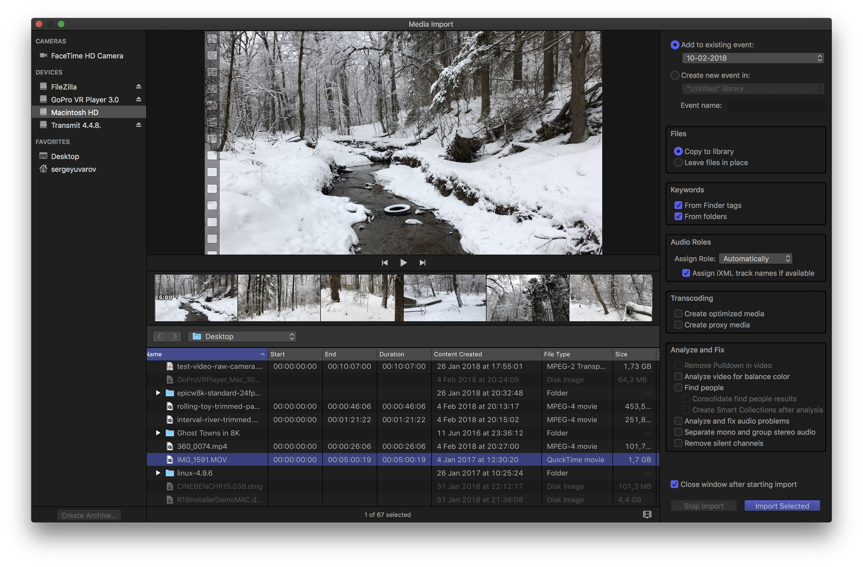 Вторая операция с тем же видео — создание прокси-файла. Это весьма жизненный сценарий, поскольку с такими тяжелыми видео лучше работать, конечно, через прокси-файл (фактически, дубль вашего файла, но в более низком разрешении; все дальнейшие монтажные операции будут делаться с ним, что сэкономит ресурсы и время, а уже при завершении работы изменения будут применены к исходному файлу). Чтобы сделать прокси-файл, надо кликнуть правой кнопкой мыши на видео в Events Browser, затем нажать Transcode Media, в появившемся окне отметить Proxy Media и нажать ОК. Не забудьте сразу в этот момент включить секундомер и следить за процессом через Background Tasks.