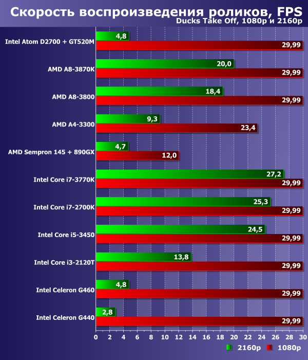 Core i7-3770 — новейший и топовый процессор Intel, построенный на архитектуре Ivy Bridge. Ни у кого не возникало сомнений, что он без труда справится со всеми роликами, и он справился. Кроме самого тяжелого — Ducks Take Off 2160p. Здесь ему плохую службу сослужил встроенный GPU, который всеми силами старался помочь с воспроизведением потока, но сделать это был явно не в состоянии. Наиболее высокий FPS в этом ролике удалось получить на плеере VLC с принудительно отключенным аппаратным ускорением. При этом нагрузка на процессор ожидаемо возросла до 100%, а счетчик кадров поднялся до 28,3 — не идеальный, но близкий к этому результат.