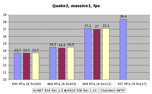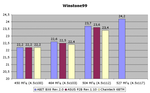Мы провели тестовые испытания по разгону процессора Intel Pentium II 450, который в обычных условиях разгоняется до 504 МГц (4.5х112) на обоих платах. Вот что получилось: