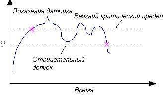 Кроме этого, для основаных на статусе числовые сенсоры, предусмотрено такое понятие, как допуск (hysteresis), который служит для предотвнащения лишних срабатываний сенсора. Допуск всегда отрицательный для верхних пределов, и всегда положительный для нижних пределов. На нижеприведённой схеме, можно ознакомиться с принципом его работы: