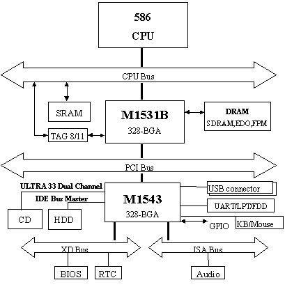 Набор микросхем Alladin IV производится в двух чипах в корпусе BGA: M1531 и М1543 (в Alladin IV используется M1533). Блок-диграмма чипсета приведена ниже: