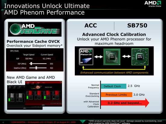 Надо расшифровать, что подразумевается под Advanced Clock Calibration, технология относится к южному мосту SB750 (что, кстати, означает, ее поддержку не только на платах с северным мостом 790GX, но и 790FX, обновленные версии уже заявлены от ASUS и Foxconn). Эффективность, то есть расширение разгонного потенциала процессоров Phenom, уже подтверждена независимыми тестами, хотя более конкретные величины, наверное, можно будет озвучить позже, когда накопится статистика, ведь разгон напрямую зависит от «удачности» процессора, участвующего в испытаниях. Сам механизм состоит не только в более стабильном тактировании, но и избирательном повышении напряжения в цепях, оказавшихся «узким местом», то есть ограничивающих стабильность в каждом конкретном случае. Попутно выпущена новая версия утилиты AMD OverDrive, в которой поддерживается разгон не только графического ядра в чипсете, но и видеопамяти на плате.