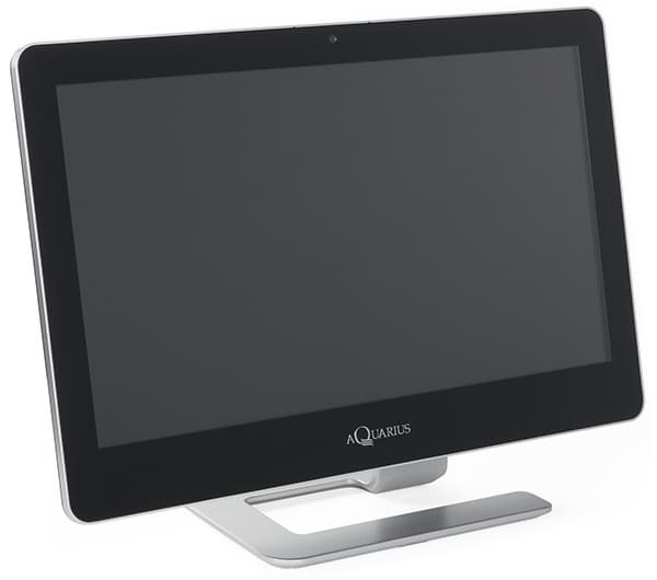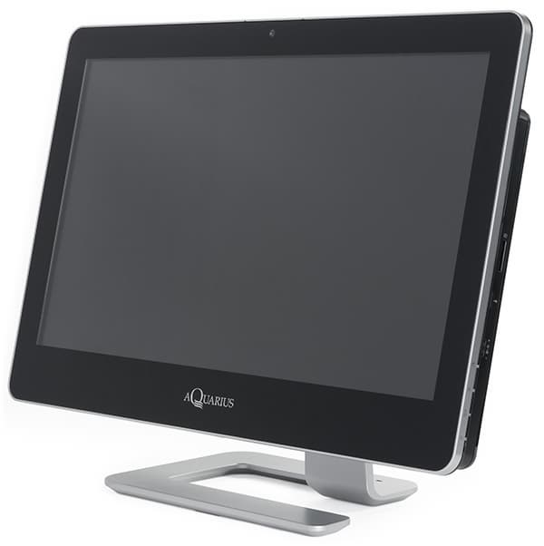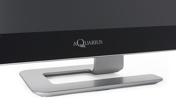 Поверхность самого ЖК-экрана отстоит от лицевой поверхности моноблока примерно на 5 мм. Рамка вокруг экрана довольно толстая: слева, справа и сверху ее толщина составляет 33 мм, а снизу — 60 мм. На верхней части рамки экрана, по центру, расположен глазок веб-камеры, а снизу — логотип компании Aquarius.