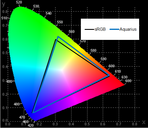 Цветовой охват матрицы довольно широкий и покрывает 103,4% пространства sRGB и 73,5% Adobe RGB. Объем цветового охвата составляет 104,1% от объема sRGB и 73,9% от объема Adobe RGB. Результат очень хороший для TN-матрицы.