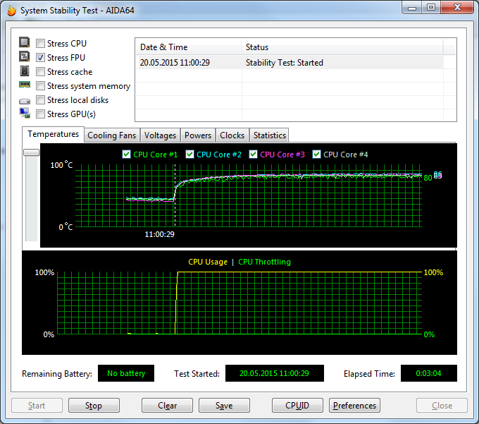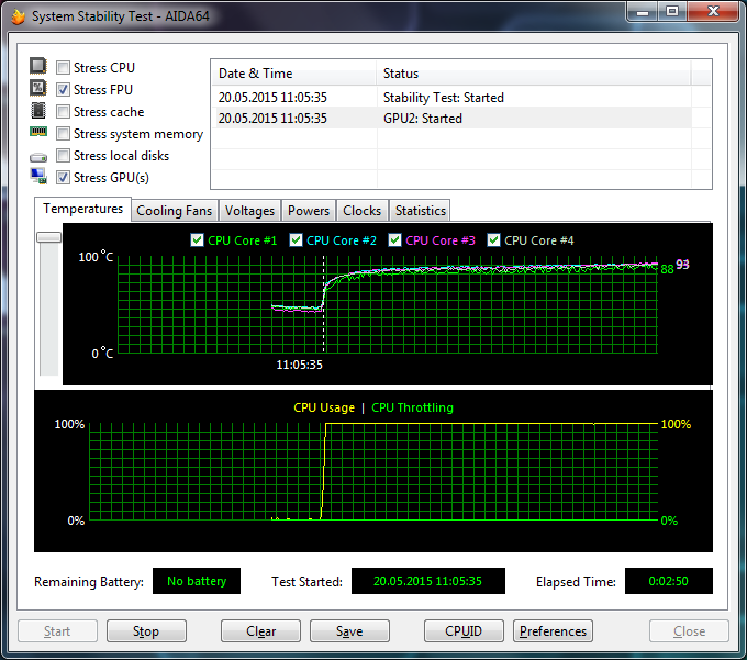 При одновременной нагрузке процессора тестом Stress FPU и графической подсистемы тестом Stress GPU частота процессора составляет все те же 3,5 ГГц, а температура его ядер возрастает до 93°С. Тем не менее, вентилятор системы охлаждения вполне справляется со своей задачей даже в этом стрессовом режиме работы.