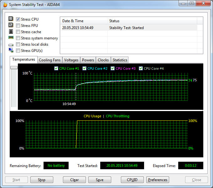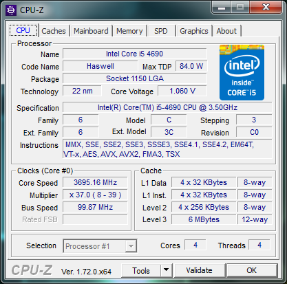 При загрузке процессора тестом Stress CPU (утилитой AIDA64 Extreme Edition — тест на стабильность системы), который использует целочисленные вычисления, частота процессора составляет 3,7 ГГц (напомним, что для процессора Intel Core i5-4690 максимальная частота в режиме Turbo Boost cоставляет 3,9 ГГц). Температура процессора в этом режиме загрузки увеличивается до 75 °С.