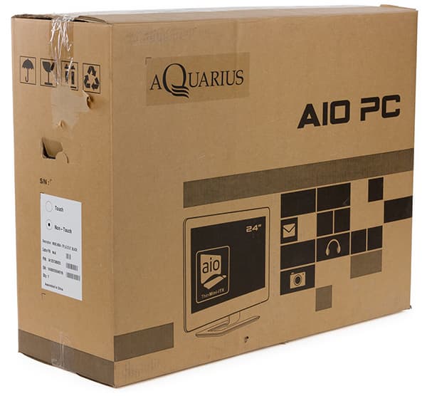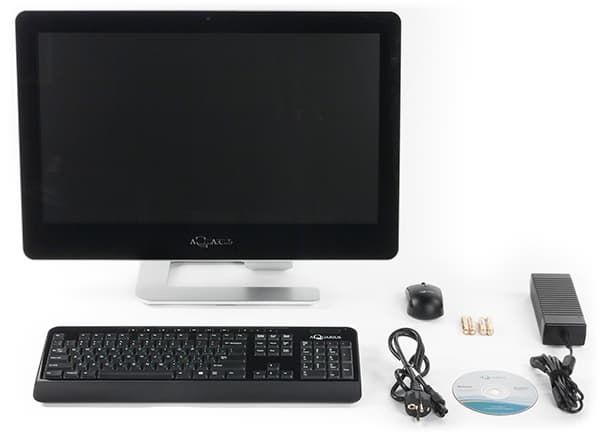 Моноблок Aquarius Mnb Elt T733H поставляется в большой картонной коробке, а в комплект поставки, кроме самого моноблока, входит комплект из беспроводной клавиатуры и мышки, адаптер питания мощностью 135 Вт (19 В, 7,1 А) и DVD-диск .