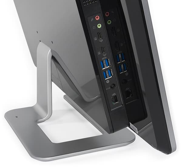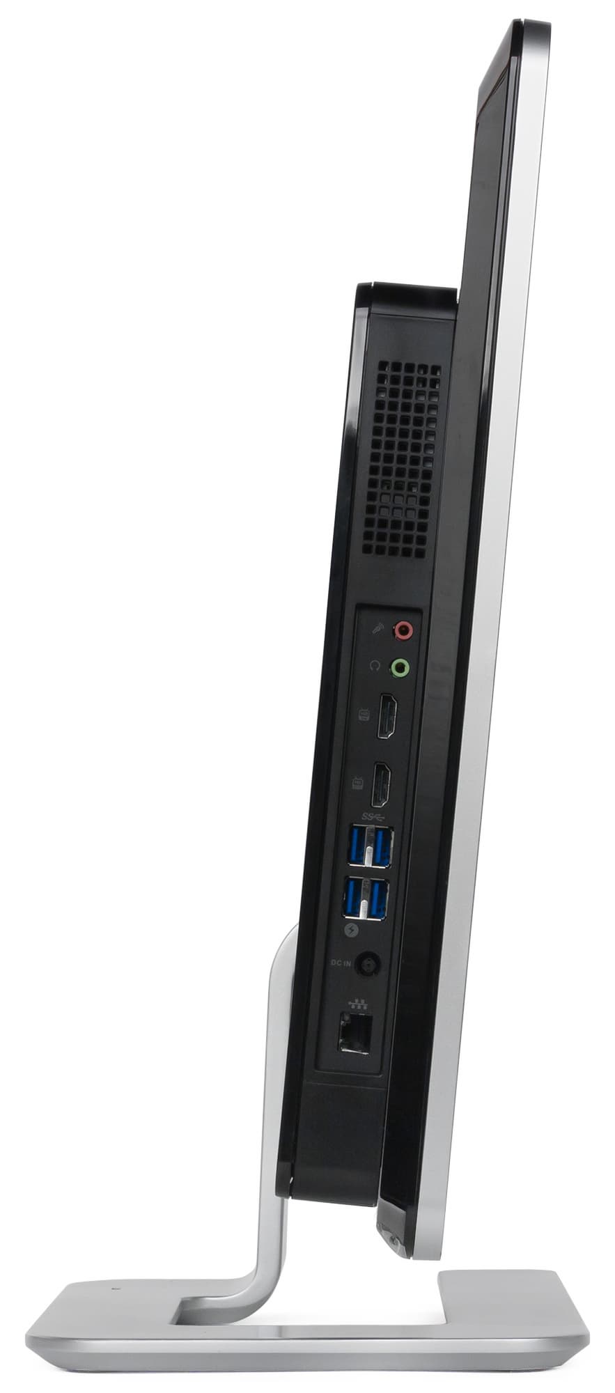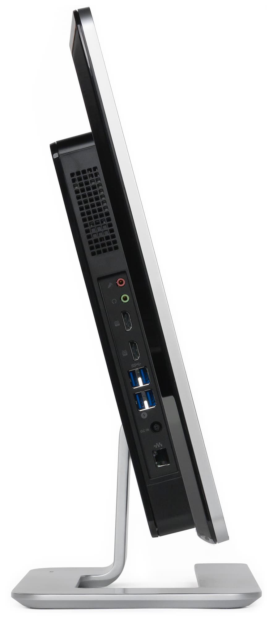На левом торце корпуса расположены четыре порта USB 3.0, разъем RJ-45, два аудиоразъема (микрофон, наушники), два разъема HDMI (вход и выход) и разъем питания. Отметим, что наличие входа HDMI позволяет использовать данный моноблок и в качестве монитора для внешнего ПК.