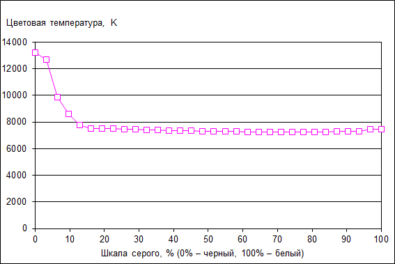 Цветовая температура экрана моноблока очень стабильная по всей шкале серого (темные области можно не учитывать из-за погрешности измерения) и составляет 7500 K.