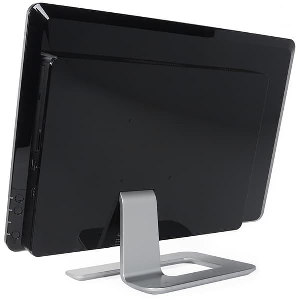 Подставка моноблока сделана из металла. Она точно такого же цвета, как и серебристая торцевая окантовка экрана. Подставка довольно увесистая, что гарантирует устойчивое положение моноблока на столе. Подставка соединяется с корпусом моноблока в нижней части задней панели и позволяет немного менять наклон экрана. А вот регулировка положения экрана по высоте не предусмотрена.