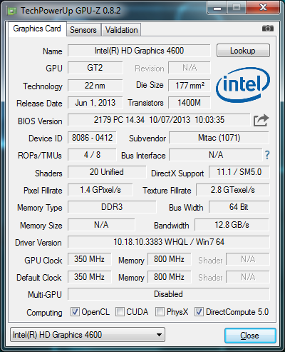 | Видеоподсистема | Intel HD Graphics 4600 | |