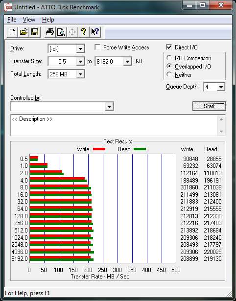 Утилита ATTO Disk Benchmark определяет максимальную скорость последовательного чтения и записи этого накопителя на уровне 200 МБ/с, что для HDD является очень хорошим результатом.