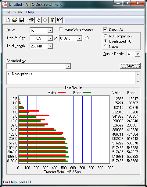 Утилита ATTO Disk Benchmark определяет максимальную скорость последовательного чтения SSD-накопителя на уровне 550 МБ/с, а последовательной записи — на уровне 520 МБ/с.