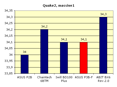 Ничего необычного на диаграммах не видно. Как того и следовало ожидать, производительность ASUS P3B-F находится на среднем уровне как по тестам, использующим офисные приложения, так и по тесту игровым приложением.