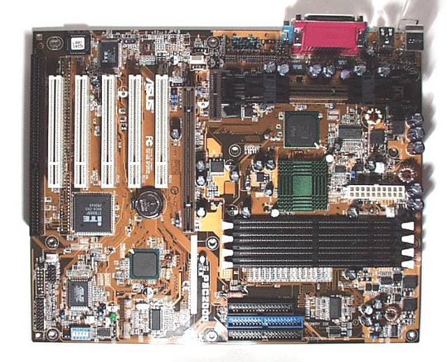 Однако, в результате того что помимо всего прочего на PCB ASUS пришлось умещать четыре чипа-хаба, чип-мост PCI-to-ISA, да еще и четыре слота DIMM, плата получилась большой, практически полноформатной ATX. Материнок такого размера на рынке немного, потому P3C2000 может иметь некоторые проблемы при установке в ряд корпусов. В остальном же дизайн платы достаточно продуманный, разъем подключения питания находится в одном из самых удобных мест — перед Slot 1.
