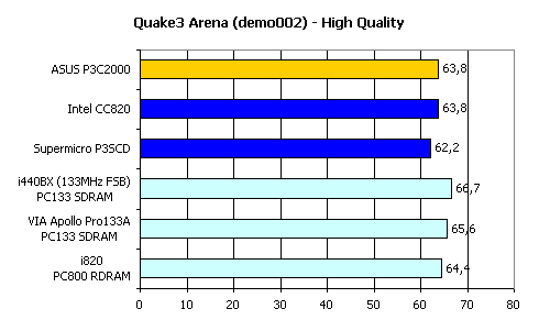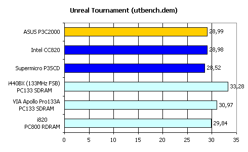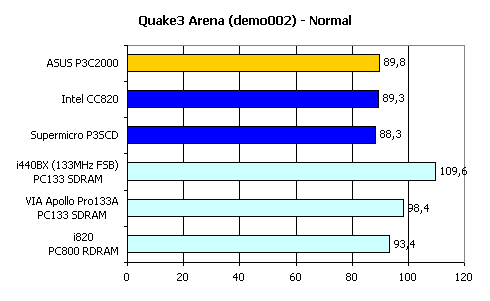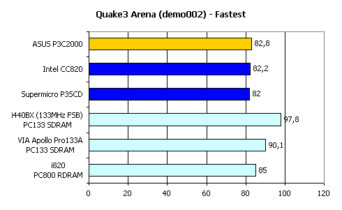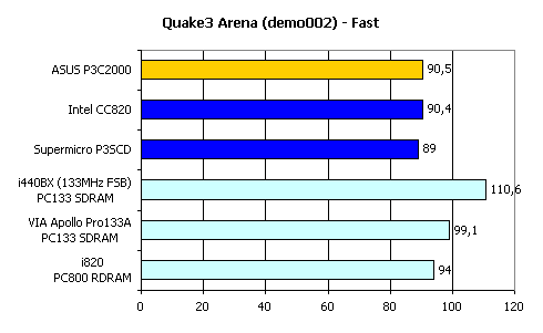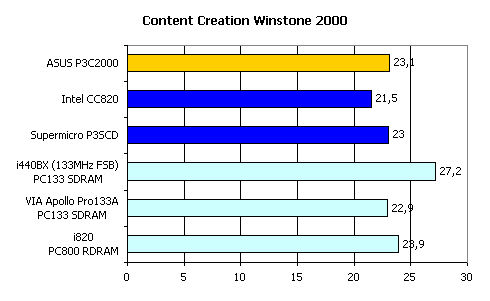 Как видим, i440BX продолжает оставаться на высоте, более чем на 10% опережая всех своих конкурентов. Что касается ASUS P3C2000, то хотя эта плата и показала лучший результат среди аналогичных, до i440BX или даже до VIA Apollo Pro133A ей, безусловно, далеко.