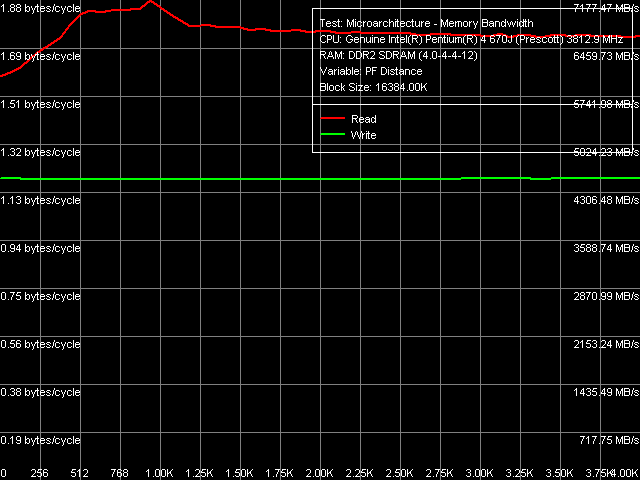 Очевидно, что значение максимальной реальной ПСП на чтение в 7177 МБ/с, далеко превышающее теоретический предел в 6400 МБ/с для 200-МГц частоты процессорной шины, может быть получено только при разгоне последней.