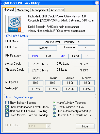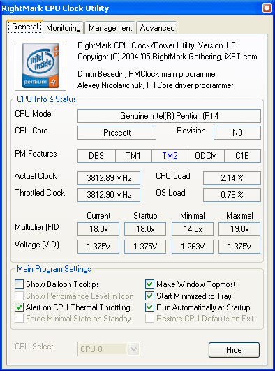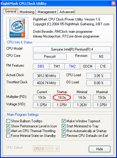 Поводом для написания этой небольшой заметки явилась... просто привычка (и заметим, весьма полезная) автора запускать в фоновом режиме утилиту RMClock при тестировании платформ на процессорах Intel Pentium 4 дабы быть уверенным в том, что последний в ходе выполнения тестов не входит в режим троттлинга, а значит, полученные результаты будут достоверными. И вот что обнаружилось уже после нескольких минут тестов платформы Intel Pentium 4 670 (3.8 ГГц) с материнской платой ASUS P5WD2 Premium (а незадолго до этого как раз была прошита последняя версия BIOS 0422 от 29 июля) процессор начал «троттлиться» с падением производительности до уровня... 105.6%!