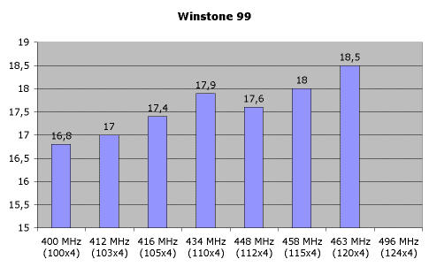 Далее, мы провели измерения производительности, показываемой системной платой ASUS P2B-B при разгоне процессора Intel Pentium II 400, который на обычной системной плате может быть разогнан до 448 МГц (112х4).