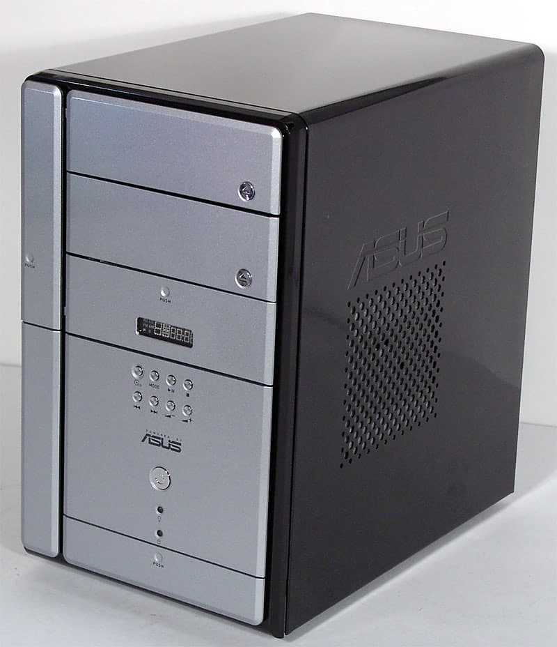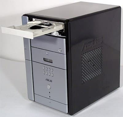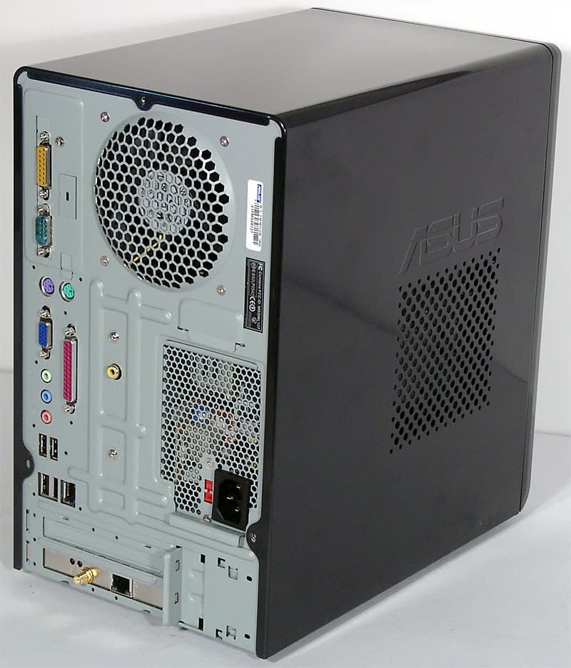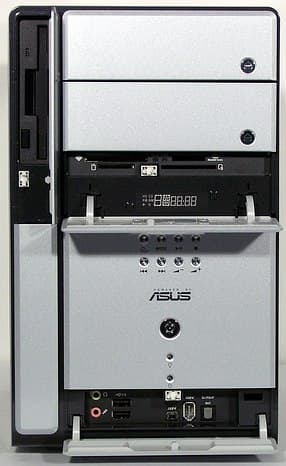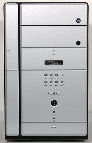 Внешний облик Terminator 2 соответствует обычным корпусам типа tower («башня»), только вид сзади несколько непривычен. Однако размеры выгодно отличают barebone-комплект ASUS: ГxВ = 300×310 мм при типичной ширине в 190 мм (уже нельзя, так как ограничивает ширина 5-дюймовых устройств). С учетом наличия у T2 двух 5-дюймовых отсеков, размеры совсем не кажутся большими для сравнения, габариты аналогичного по возможностям расширения «кубика» Soltek EQ3401 составляют 215x330x200 мм (ШxГxВ), то есть, грубо говоря, T2 в полтора раза выше при сохранении остальных размеров. Вот материал корпуса (сталь вместо алюминия у «кубиков») действительно создает иное ощущение от миникомпьютера такой с собой не потаскаешь, рюкзака для переноски в комплекте можно не ждать.