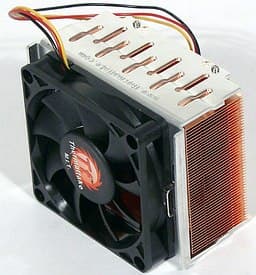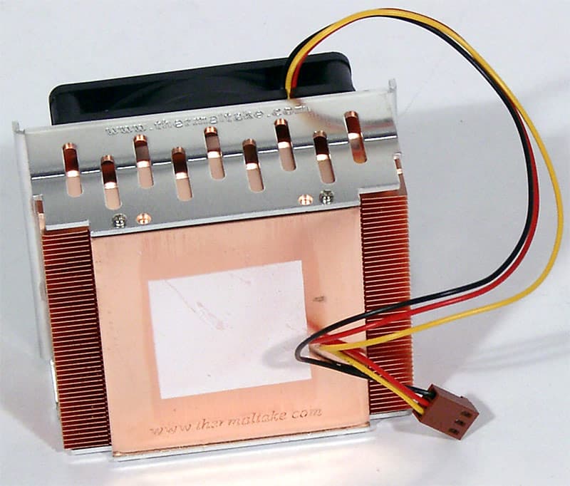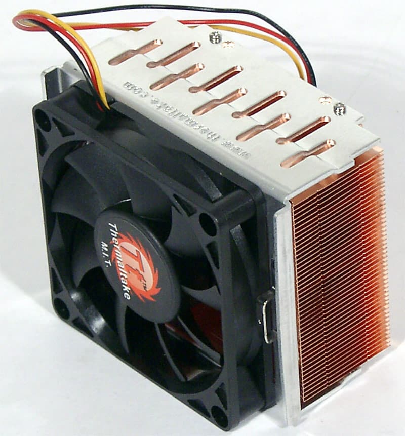 Для охлаждения процессора в T2 используется, к нашему удивлению, кулер Thermaltake (непонятно, то ли модель Spark 5, то ли Spark 6). Удивление вызвано тем, что ASUS недавно анонсировал линейку собственных кулеров, а ранее при необходимости всегда применял продукты своего постоянного партнера AVC. Тем не менее, для моделей Terminator 2 выбрано решение от, во всех смыслах, стороннего производителя. Кулер представляет собой цельномедный радиатор (83x70,6x45 мм) с рядом прямых тонких ребер (способ сопряжения с пластиной основания неизвестен, так как у Spark 5/6 он разный) и 70-миллиметровым вентилятором (заявлена производительность в 33,8 CFM). Подошва радиатора хорошо отполирована, на нее заранее нанесен слой термопасты. Крепление кулера абсолютно стандартное, на рамку вокруг процессорного сокета, так что при желании вы можете купить и использовать любое другое устройство охлаждения.
