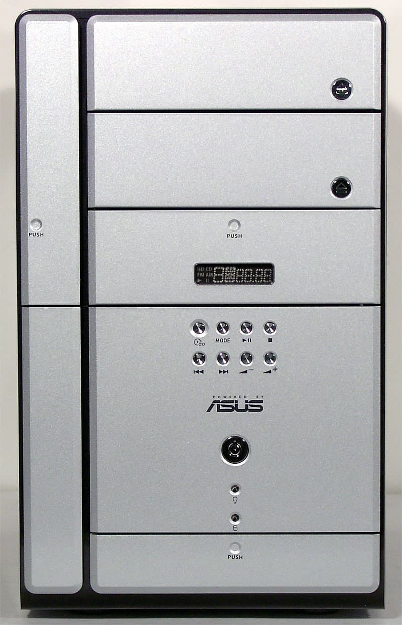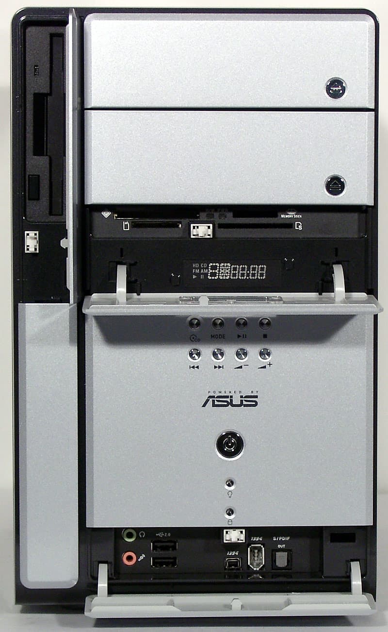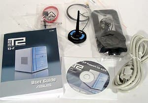 Суммируя уже упомянутые ранее детали: в комплект поставки ASUS T2-P входят предустановленный флоппи-дисковод, кулер на процессор, кабели, руководства и CD. Вариант Deluxe предполагает измененную переднюю панель со светоиндикаторным дисплеем, кнопками управления режима Audio DJ и наличие предустановленного картовода и FM-тюнера. Вариант Commercial Deluxe всего лишь «узаконивает» появление в комплекте предлагаемой отдельно многофункциональной карты расширения. На компакт-диске присутствуют необходимые драйверы и утилиты для мониторинга состояния системы, обновления BIOS, прослушивания радио (очень простенькая программа) и контроля параметров беспроводного сетевого соединения.