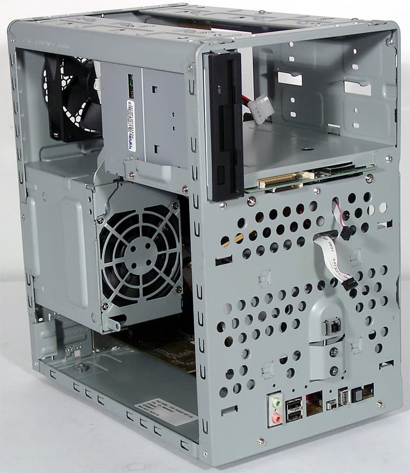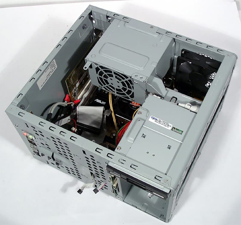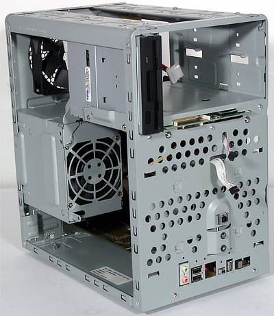 Достаточно просторный по объему корпус внутри производит впечатление плохо спланированного. Не так уж много комплектующих требовательны к охлаждению, но все они размещены крайне неудачно. Прямо над процессорным кулером нависает стенка блока питания, обе карты расширения прижаты к днищу корпуса в худших традициях полноразмерных плат с шестью слотами PCI, винчестер монтируется с обратной стороны передней панели. Впрочем, насколько это скажется на температурном режиме, мы выясним в соответствующем разделе. Зато довольно удобна модернизация системы, так как БП снимать придется только для замены или установки процессора с кулером, причем БП крепится к раме корпуса всего одним винтом и рядом упоров. Разъемы модулей памяти и слоты для карт расширения спокойно доступны в любой момент, и только с винчестером придется повозиться, так как он устанавливается в специальный поддон, который затем монтируется на стенку передней панели в вертикальном положении. Кстати, второй жесткий диск вполне можно разместить в отсеке флоппи-дисковода, если вы справедливо полагаете последний пережитком прошлого.