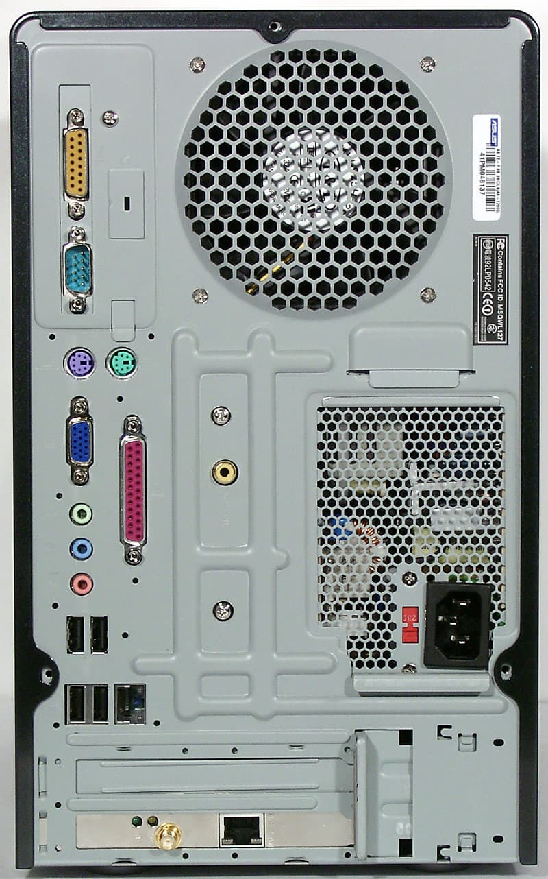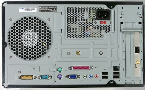 - Разъемы на задней панели: 1 COM, 1 Game, 2 PS/2, 1 LPT, 1 VGA, 3 Audio (для вывода 6-канального звука), 4 USB (2.0), 1{2} LAN (Fast{+Gigabit} Ethernet), {вход для радиоантенны}, [вход для FM-антенны]