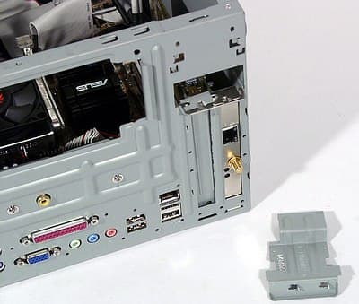 Просторная задняя панель дает достаточно места для размещения значительного количества интерфейсных разъемов, двух планок расширения, двух карт расширения, выхода БП и большого вентилятора. Отметим, что блок питания все же обладает своим вентилятором, но расположение того в глубине корпуса, а не вплотную к решетке задней панели должно благотворно повлиять на производимый им уровень шума. Планки расширения предусмотрены производителем в единственном варианте: в центре задней стенки монтируется FM-тюнер со входом для поставляющейся в комплекте антенны, а в верхней части есть (оставшееся в нашем случае незанятым) место для крепления планки с софт-модемом (и двумя телефонными розетками). Карты расширения, забегая вперед, возможны любые (1 AGP и 1 PCI); механизм их крепления с помощью специальной прижимной планки-костыля не требует винтов, но не слишком удобен.