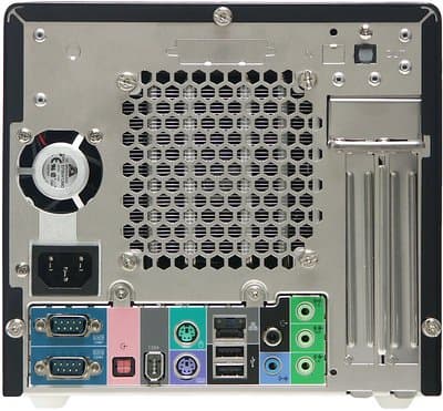Задняя панель выглядит так же, как и у большинства современных barebone-комплектов, разве что отсутствует VGA-выход, поскольку данная модель основана на дискретном чипсете. Набор стандартных интерфейсных разъемов выглядит так: PS/2-порты для клавиатуры и мыши, 2 COM-порта (параллельный может быть выведен на покупаемую отдельно планку), порт FireWire, 2 разъема USB (2.0), сетевая розетка (Gigabit Ethernet) и 4 аудиоразъема для вывода 6-канального звука. Есть возможность получать и передавать звук «в цифре», для чего в наличии оптический вход и выход S/PDIF, а также коаксиальный выход S/PDIF. Материнская плата комплекта позволяет дополнительно подключать 4 порта USB (есть возможность отдельно приобрести соответствующую планку на 2 порта на заднюю панель) и устанавливать две карты расширения. Присмотревшись, внимательный читатель обнаружит справа от аудиоразъемов маленькую дырочку в задней стенке корпуса это не дефект, не технологическое отверстие и даже не вентиляция. Это отверстие для доступа к кнопке сброса CMOS! Вот такой оригинальный шаг разработчиков навстречу нуждам рядового оверклокера. :)