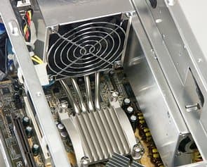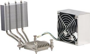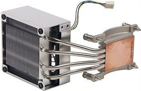 В качестве процессорного кулера в Shuttle SB77G5 используется традиционная для всех barebone-комплектов компании система ICE, но новой модификации. Принцип ее функционирования все тот же: радиатор с впрессованной в днище медной пластиной снимает тепло с процессора и по тепловым трубкам передает его верхнему радиатору, который крепится у решетки на задней панели корпуса. К верхнему радиатору крепится мощный вентилятор, который одновременно вытягивает горячий воздух из корпуса и продувает, охлаждая, пластинчатые ребра этого радиатора. Новая модификация ICE имеет необычно выглядящий («под титан») процессорный радиатор (согласно данным Shuttle, его термальное сопротивление уменьшено чуть ли не вдвое по сравнению с ранними моделями ICE) и увеличенный, теперь 92-миллиметровый, вентилятор (Shuttle DA09225R12U). Данное решение представляется очень удачным, так как использовавшийся ранее 80-миллиметровый вентилятор от Sunon хотя и обладал отличной производительностью, но очень уж сильно шумел. (В результате, состоятельные покупатели систем Shuttle XPC даже заказывали у сторонних компаний специальный вентилятор с пониженным уровнем шума при той же или большей мощности.)