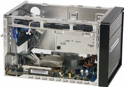 Как обычно, для снятия крышки с корпуса SB77G5 достаточно открутить три винта-барашка сзади, еще два винта чтобы вынуть дисковую корзину, а четыре защелки удерживают на месте переднюю панель. Таким образом, за считанные секунды, практически без возни с отверткой, вы можете получить полностью готовую к сборке и модернизации систему.