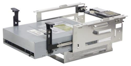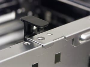 Специальные приспособления на концах держателей для CD/DVD-привода позволяют зафиксировать дисковую корзину в ее рабочем положении — таким образом, и здесь от винтов удалось избавиться.