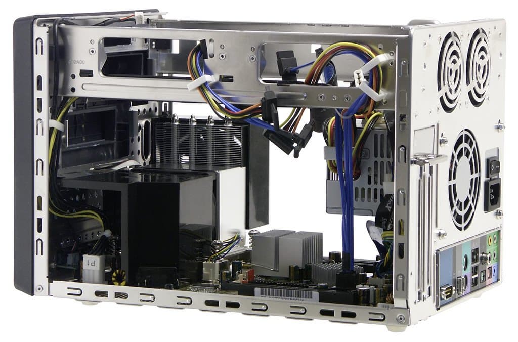 Серия корпусов «P» предполагает стратегию охлаждения, радикально отличающуюся от уже хорошо знакомой нам по серии «G». Напомним, что, не считая вентилятора в блоке питания, в корпусах Shuttle обычно присутствовал всего один кулер — процессорный и общесистемный (ICE). Причем в некоторых моделях БП охлаждался пассивно (но зато иногда вентилятор устанавливался на чипсетный радиатор). Теперь же количество вентиляторов увеличилось до умопомрачительной цифры «5» (и это не беря в расчет видеоускоритель, почти наверняка тоже охлаждаемый активно). Причем и от ICE (если понимать под ним процессорный кулер, выполненный с применением тепловых трубок) в SB95P V2 не отказались. Давайте посмотрим, как же функционирует это чудо НТП.