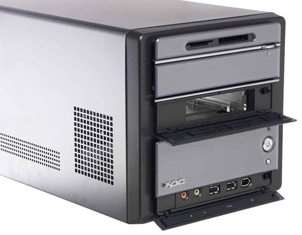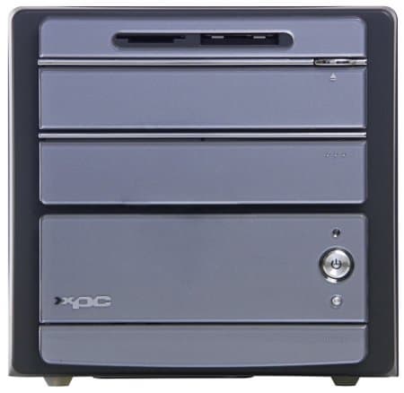 Уж сколько раз производители подобных систем пытались избавиться от флоппи-дисковода — искоренить внешний 3-дюймовый отсек полностью или монтировать в него картовод — но приходилось откатываться назад. В данном случае в Shuttle и место для этого дисковода оставили, и картовод установили (все же не зря увеличивали размеры корпуса). Второй (5-дюймовый) отсек для накопителей закрыт подпружиненной крышкой, которая распахивается при выдвижении лотка CD/DVD-привода и автоматически закрывается после загрузки диска. Необычно, что кнопка на передней панели, позволяющая выдвинуть/задвинуть лоток, расположена выше, а не ниже отсека с приводом, поэтому первое впечатление от нее — это кнопка выброса карты из картовода. :)