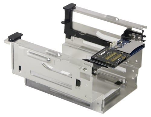 Затем держатели с «интерфейсной» стороны винчестера надеваются на ролики стойки корпуса, а защелки с противоположной стороны фиксируются на другой стойке. Учитывая, что «ножки» держателей опираются на поверхность оптического привода, конструкция получается надежной, а в целом установка осуществляется за считанные секунды. По окончании к диску (через отверстия в стойке) подсоединяются шлейфы (интерфейсный и питания), которые имеют специальные пластиковые «хвостики» на коннекторах для удобства отключения.