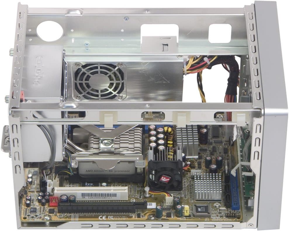 Как обычно, для снятия крышки с корпуса SB77G5 достаточно открутить три винта-барашка сзади, еще два винта — чтобы вынуть дисковую корзину, а четыре защелки удерживают на месте переднюю панель. Таким образом, за считанные секунды, практически без возни с отверткой, вы можете получить полностью готовую к сборке и модернизации систему.