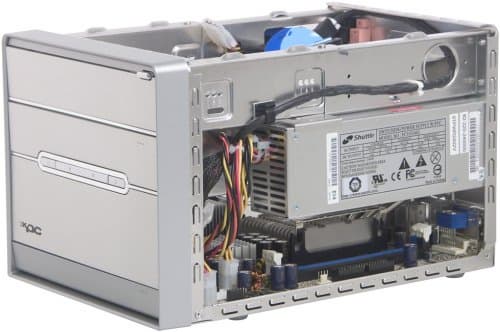 Замечательной особенностью внутреннего дизайна G5 является полное отсутствие путаницы проводов и кабелей, характерной для предыдущих поколений корпусов Shuttle. Интерфейсные разъемы для передней панели продуманно разводятся у переднего края платы, а выходы для подключения кабелей S/PDIF и звуковые входы, как и разъем для процессорного вентилятора, — у задней. Более того, barebone-комплект продается с уже предустановленными шлейфами для дисковых накопителей, а «хвосты» разъемов питания от БП продуманно разделены, проложены по стойкам корпуса (к предполагаемому месту использования) и закреплены стяжками. Повторимся, внутренний дизайн G5, на наш взгляд, очень удачен и вполне подстать внешнему виду корпуса.