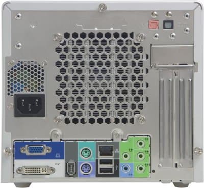 Задняя панель выглядит так же, как и у большинства современных barebone-комплектов, разве что аналоговый VGA-выход не только присутствует, но и дополнен к тому же цифровым DVI-выходом на монитор. Набор стандартных интерфейсных разъемов выглядит так: PS/2-порты для клавиатуры и мыши, порт FireWire, 2 разъема USB (2.0), сетевая розетка (Gigabit Ethernet) и 5 аналоговых аудиоразъемов для вывода 8-канального звука. Есть возможность получать и передавать звук «в цифре», для чего в наличии оптический вход и выход S/PDIF. Материнская плата комплекта позволяет реализовать еще 4 порта USB (есть возможность дополнительно приобрести соответствующую планку для вывода портов на заднюю панель) и устанавливать две карты расширения. COM-портов нет, параллельный порт может быть выведен на покупаемую отдельно планку. Между аудиоразъемами и местом вывода карт расширения в задней стенке корпуса есть маленькая дырочка — это уже знакомое нашим читателям отверстие для доступа к кнопке сброса CMOS (пользоваться очень удобно).