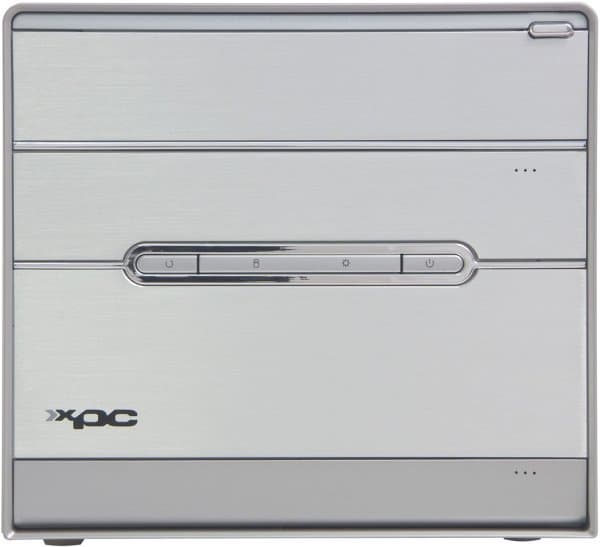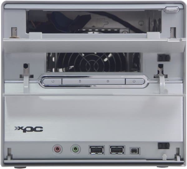Во внешнем виде передней панели применение корпуса G5 означает наличие откидывающихся крышек на отсеках для дисковых накопителей и интерфейсных разъемов. Крышка 5-дюймового отсека традиционно для таких решений подпружинена, так что распахивается при выдвижении лотка CD/DVD-привода и автоматически закрывается после загрузки диска. Корпус (как и всегда) алюминиевый, у этой модели он покрыт серой краской, а пластиковая накладка на переднюю панель для основной части поверхности использует слегка недошлифованные алюминиевые пластины — смотрится отлично! Размер корпуса стандартный (для Shuttle XPC) — 200x300x185 мм (ШxГxВ).